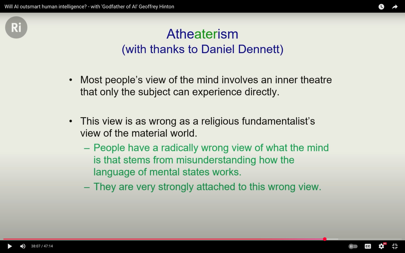 The slide has the heading “Atheaterism” and below it “with thanks to Daniel Dennett”. I have reviewed the philosopher Daniel Dennett’s book “Consciousness Explained” in a series of articles and shown the various insufficiencies in his theories. Hinton appears to repeat many of Dennett’s mistakes. For a more detailed analysis of those mistakes, the reader can take a look at my review of Dennett’s work.